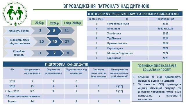 11 сімей патронатного вихователя функціонувало на Вінниччині в 1 півріччі цього року. У них перебувало 27 дітей, а за весь час діяльності патронату в області він надав тимчасовий прихисток 73 ...