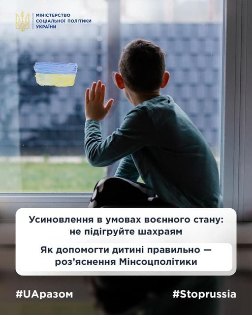 Як допомогти дитині правильно - роз’яснення Мінсоцполітики Останнім часом засоби масової інформації та соціальні мережі активно поширюють заклики терміново усиновити дітей, які втратили батьків внаслідок війни Росії проти України, а ...