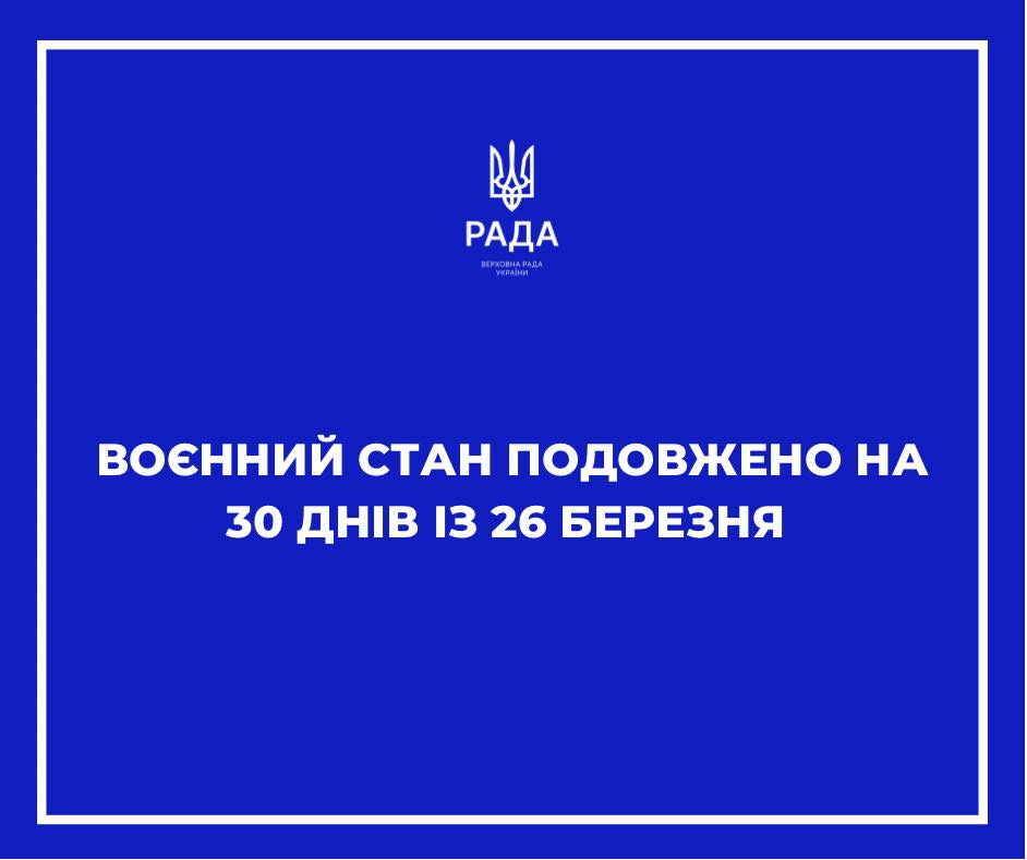 В Україні продовжено воєнний стан, запроваджений на тлі нападу Росії 24 лютого. Його дію буде пролонговано на 30 діб з 05:30 26 березня.
